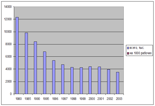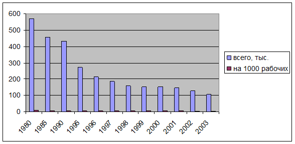 Статистика травматизма на производстве в РФ При изучении травматизма на производстве определяется численность пострадавших при несчастных случаях на производстве с утратой трудоспособности на один рабочий день и более и со смертельным исходом (рис. 25-28, приложение А, табл. 13), эта величина определяется в тысячах человек и на 1000 работающих. Численность пострадавших при несчастных случаях на производстве с утратой трудоспособности на один рабочий день и более уменьшается от 88 тысяч человек в 2004 г. до 78 тысяч в 2005 г., этот же показатель на 1000 работающих изменяется от 3,4 до 3,1 соответственно. Потеря рабочего времени от несчастных случаев на производстве составляли в 2005 г. 2,5 млн. человеко-дней. Численность пострадавших при несчастных случаях на производстве со смертельным исходом уменьшается от 3292 человек до 3091 человек в 2004 г. и в 2005 г. соответственно, этот показатель на 1000 работающих уменьшается от 0,129 до 0,124 соответственно. Изучается также численность пострадавших на производстве по следующим видам экономической деятельности (рис. 29-36, приложение А, табл. 14): а) сельское хозяйство, охота и лесное хозяйство; б) добыча полезных ископаемых; в) обрабатывающие производства; г) производство и распределение электроэнергии, газа и воды; д) строительство.