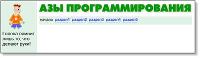 Рис 7.46. Слоган в этом примере записан под логотипом Содержательно слоган должен передавать основную идею продукта и содержать не более шести-восьми слов. Автор сайта, на котором представлены обучающие материалы по программированию, решил придумать слоган. — Ага! — подумал автор. — Надо отразить особенность. А особенность моих материалов в том, что все теоретические вопросы обязательно подкрепляются практическими заданиями. И автор придумал ключевую фразу: «моя голова хорошо запоминает лишь то, что делают мои руки». Фраза получилась длинной, и после мучительных урезаний была сокращена до «голова помнит лишь то, что делают руки». Главная страница в отличие от других страниц сайта предлагает не только навигационное меню, но и краткие обзоры содержащихся на сайте материалов. Именно поэтому Главная страница играет роль основного навигационного узла, и пользователи охотно используют её как мощную информационную развязку (рис. 7.47).