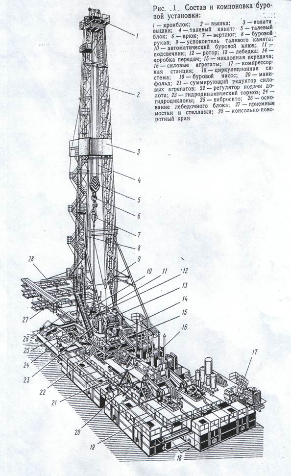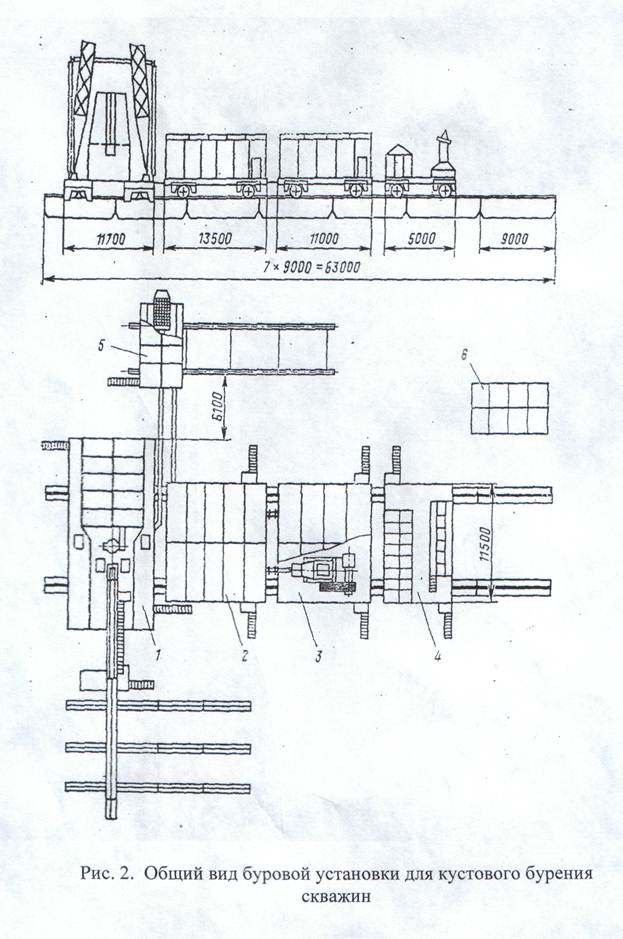 3. Техническая характеристика буровой установки для бурения кустов в районах Западной Сибири. Высокие темпы и масштабы освоения нефтяных месторождений Западной Сибири выявили ряд научно-технических проблем, решение которых позволило разработать технические средства для проводки наклонно-направленных скважин и контроля их пространственного отложения, различные конструкции крупноблочных буровых оснований, специальные буровые установки для строительства кустовых скважин. Кустовое строительство скважин имеет ряд существенных достоинств. Прежде всего это значительное сокращение материальных и трудовых затрат на строительство и инженерное обустройство кустовых оснований, подъездных путей и трасс, особенно в условиях заболоченных территорий и бездорожья. Кроме того, существенно уменьшаются затраты на промысловое обустройство скважин, сооружение нефтегазосборных сетей, энергоснабжение промысловых объектов, ремонт и эксплуатационно-техническое обслуживание скважин. Для кустового бурения скважин в Западной Сибири предназначена установка БУ-3000 ЭУК-1М с эшелонным расположением оборудования (рис. 2) Современные буровое установки включают следующие составные части: - буровое оборудование (талевый механизм, насосы, буровая лебедка, вертлюг, ротор, силовой привод и т.д.); -буровые сооружения (вышка, основания, сборно-расборные каркасно-панельные укрытия, приемные мостки и стеллажи); - оборудование для механизации трудоемких работ (регулятор подачи долота, механизмы для автоматизации спуско-подъемных операций, пневматический клиновой захват для труб, автоматический буровой ключ, вспомогательная лебедка, пневмораскрепитель, краны для ремонтных работ, пульт контроля процессов бурения, посты управления); - оборудование, для приготовления, очистки и регенерации бурового раствора (блок приготовления, вибросита, песко- и илоотделители, подпорные насосы, емкости для химических реагентов, воды и бурового раствора); - манифольд (нагнетательная линия в блочном исполнении, дроссельно-запорные устройства, буровой рукав); -устройства для обогрева блоков буровой установки (телогенераторы, отопительные радиаторы коммуникации для развода теплоносителя). Состав и компоновка буровой установки показаны на рис. 1. На долю кустового строительства скважин приходится в настоящее время более 70%всего объема эксплуатационного бурения и имеется перспектива дальнейшего его расширения на промыслах нефтегазодобывающих районов нашей страны. Начало освоения нефтяных богатств Западной Сибири дало мощный толчок развитию этого способа.