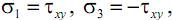 По закону парности касательных напряжений в продольных сечениях бруса, так же как и в его поперечных сечениях будут возникать только касательные напряжения. Тогда на гранях (параллельных соответствующим осям координат) бесконечно малого элемента, «вырезанного» в окрестности любой точки стержня при сдвиге, будут действовать только касательные напряжения τ. Такой случай напряженного состояния называют чистым сдвигом. Чистый сдвиг – частный случай плоского напряженного состояния, при котором по граням прямоугольного элемента действуют только касательные напряжения. Определим величину и направление главных напряжений при чистом сдвиге:
