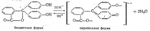 Существую несколько теорий, объясняющих механизм изменения окраски индикаторов: 1) Ионная теория (Оствальд, 1894) – рассматривает индикаторы как органические кислоты и основания, диссоциирующие в растворе на ионы. При этом молекулярная и ионная формы индикатора имеют разную окраску: HInd (red) ↔ H+ + Ind- (blue) (в нейтр. среде – равновесие форм, окраска фиол.(лакмус)) В кислой среде: H+ + Ind- → HInd – красный В щелочной среде: HInd + ОН- → Ind- + Н2О (синий) Недостаток теории – не учитывает влияния строения молекул индикаторов на цветность 2) Хромоформная теория - изменение окраски индикаторов связано с обратимой пере- группировкой атомов в молекуле органического соединения. Такая обратимая перегруппировка в органической химии называется таутомерией. Она происходит при изменении рН раствора. Установлено, что в молекулах индикатора имеются группировки атомов с кратными связями (-N=N-, O=N-, =C=O). Такие группировки называются хромофорами, они способны избирательно поглощать электромагнитные колебания УФ спектра и, следовательно, изменять окраску. Когда таутомерное превращение ведет к изменению строения хромофора – окраска изменяется; если же после перегруппировки молекула не содержит более хромофора – окраска исчезнет. Недостаток – не учитывает диссоциацию молекул индикатора в растворе. 3) Согласно ионно-хромофорной теории, изменение окраски индикаторов обусловлено переходом из ионной формы в молекулярную, и наоборот, сопровождающегося изменением структуры индикаторов. Таким образом, один и тот же индикатор может существовать в двух формах с разным строением молекул, причем эти формы могут переходить одна в другую, и в растворе между ними устанавливается равновесие. Пример: фенолфталеин: