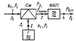 Смеситель передатчика предназначен для преобразования сигнала промежуточной частоты в сигнал СВЧ. Смесители передатчика работают при относительно большом уровне сигнала (от нескольких до сотен милливатт и даже до нескольких ватт), поэтому их принято относить к классу смесителей высокого уровня мощности. К этому же классу относятся и смесители для преобразователей сдвига частоты, с помощью которых осуществляются транспонирование спектра по частоте в ретрансляторах прямого усиления и преобразование частоты гетеродина передатчика в частоту гетеродина приемника в ретрансляторах с общим гетеродином. На входы смесителя (рис. 6) подают: 1 – напряжение сигнала u c, представляющего собой ЧМ колебания промежуточной частоты (т.е. f c = f пч, с мощностью Р с), 2 – немодулированные СВЧ колебания от гетеродина с напряжением u г и мощностью P г. Эти колебания одновременно поступают на нелинейный элемент смесителя, например полупроводниковый диод, для которого зависимость между входным напряжением u вх и выходным током i д можно записать в виде: