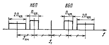 где u вх = u c + u г; аm – постоянные коэффициенты, определяемые по вольт-амперной характеристике диода. Выходной ток смесителя будет содержать колебания с частотами гармоник сигнала и гетеродина и со всевозможными комбинациями этих частот. Частота и мощность колебаний на выходе смесителя обозначены f сумм и Р 3. Спектр частот на выходе смесителя передатчика показан на рис. 7, П чм – ширина спектра ЧМ сигнала на промежуточной частоте. Выходной ФБП (фильтр боковой полосы) выделяет одну из боковых полос: верхнюю (ВБП) или нижнюю (НБП), в зависимости от расстановки частот на РРС. Выделенную полосу частот называют рабочей. Неиспользуемую полосу – второй боковой полосой.