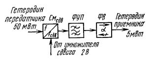 В качестве нелинейных элементов в смесителях применяют полупроводниковые диоды двух типов: диоды с переменным сопротивлением (мощные смесительные диоды) и варикапы, работающие в режиме нелинейной емкости. Такие варикапы называются варакторами (параметрическими диодами). Эти диоды, в отличие от обычных полупроводниковых диодов, принципиально позволяют получить усиление модулированного сигнала при преобразовании частоты. Для преобразователя частоты передатчика принято указывать следующие параметры: коэффициент преобразования K пр или потери преобразования а пр, коэффициент использования мощности гетеродина K г (или КПД в цепи гетеродина) и общий КПД преобразования η. Их определяют так: K пр = Р вых / Р с, а пр = – 10 lg K пр, K г = Р вых / Р г , η = Р вых /(Р с +Р г), где Р вых – мощность сигнала на выходе преобразователя частоты. Если преобразователи частоты работают при сигналах ПЧ, имеющих мощность много меньшую, чем колебания гетеродина, то для них значения K г и η совпадают. Однако при расчетах режимов работы мощных преобразователей частоты важно их различать. Эффективность работы преобразователя тем выше, чем меньше потери преобразования и выше КПД. Кроме того, преобразователь частоты должен иметь в пределах рабочей полосы частот равномерный коэффициент преобразования и равномерную характеристику ГВЗ, как и любое другое устройство ВЧ тракта. От преобразователя частоты передатчика обычно требуют довольно высокую выходную мощность: от десятков милливатт до ватта и более. Большие значения Р вых нужны в передатчиках, выполненных полностью на транзисторах и не имеющих усилителя мощности. В них обеспечивают высокий КПД в цепи гетеродина K г. Для этого используют специальные мощные смесительные диоды с малыми потерями преобразования и варакторы, выдерживающие большие подводимые мощности. Для мощных преобразователей частоты обычно указывают наибольшие допустимые значения подводимых ПЧ и СВЧ колебаний, выходную мощность и потери преобразования. Смесители передатчика строят по однотактной и двухтактной схемам. В двухтактной схеме к смесителю можно подвести примерно вдвое большую мощность, чем в однотактной, так как в первой суммируются мощности, рассеиваемые двумя диодами. Однотактный преобразователь чаще всего применяется для сдвига частоты. В преобразователе сдвига аппаратуры «Восход-М» (рис. 8) применен смеситель сдвига (Смсдв) проходного типа. Он представляет собой волноводную смесительную головку, помещенную между двумя объемными резонаторами, один из которых настроен на частоту гетеродина передатчика, другой – на частоту гетеродина приемника. На коаксиальный вход смесителя подается напряжение с выхода умножителя сдвига с частотой 266 МГц. К выходному волноводу смесителя подключен фильтр узкой полосы (ФУП), настроенный на частоту гетеродина приемника. Он дополнительно отфильтровывает паразитные частоты преобразования. Фильтр нагружен на ферритовый вентиль (ФВ). Такой преобразователь является узкополосным, что и требуется в цепи сдвига. Потери преобразования в схеме с диодом типа Д-501 составляют около 10 дБ.