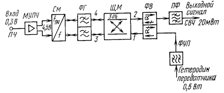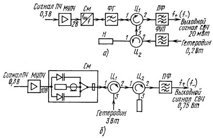 Если требования к выходной мощности смесителя невелики, то он обычно строится по однотактной циркулярной схеме (рис. 10 а). Сигнал промежуточной частоты, усиленный в мощном УПЧ (МУПЧ), смешивается с колебаниями СВЧ гетеродина в смесителе (См). Нелинейным элементом является кремниевый варактор средней мощности, обладающий нелинейной зависимостью емкости p-n -перехода от напряжения на нем. Для разделения цепей преобразованного сигнала и гетеродина используется ферритовый циркулятор (Ц1). Гетеродин через фильтр узкой полосы (ФУП) и нагруженный ферритовый циркулятор (Ц2), выполняющий функции вентиля, подключен к плечу 3 циркулятора Ц1. В соответствии с направлением циркуляции энергия попадает в плечо 1 и подается на смеситель. Под действием напряжения ПЧ полное комплексное сопротивление варактора меняется и происходит модуляция СВЧ колебаний гетеродина, которые, отражаясь от смесителя, поступают через плечи 1 и 2 циркулятора Ц1 к полосовому фильтру. Колебания полезной боковой полосы частот выделяются фильтром (ПФ). Энергия второй боковой полосы частот отражается от него и поглощается в нагрузке (Н) циркулятора Ц2 в цепи гетеродина. Если в передатчике отсутствует усилитель СВЧ, то выходным каскадом будет варакторный преобразователь частоты и для повышения выходной мощности должны быть приняты меры к увеличению КПД по гетеродину. Та же цель достигается построением преобразователя по балансной схеме, поскольку при неизменной эффективности преобразования вследствие возрастания входной мощности, которую можно подать на смеситель, увеличивается его выходная мощность. Балансный преобразователь частоты применен в полностью полупроводниковом передатчике аппаратуры КУРС-4 (рис. 10 б). При мощности гетеродина 3 Вт и модулирующем напряжении ПЧ на варакторах около 10 В мощность выходного сигнала составляет 0,75 Вт, что соответствует КПД в цепи гетеродина 25%. Дальнейшего повышения эффективности варакторного преобразователя частоты можно добиться, если обеспечить вторичное преобразование энергии побочных составляющих преобразования в энергию колебаний полезной боковой полосы частот.