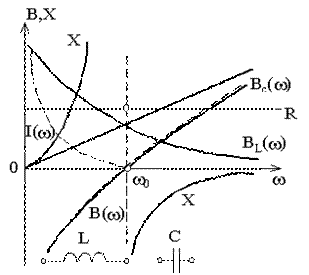 Контур без потерь. Частотные зависимости параметров параллельного контура от частоты имеют вид: BL(w) = 1/(wL); BC(w) = wC; B(w) = (1/wL) - wC; X(w) = 1/B(w). (12) На рисунке 9.2 изображены графики этих зависимостей. Из рисунка следует: при w < w0входное сопротивление контура Х носит индуктивный, а при w > w0ёмкостной характер, причём вследствие отсутствия потерь при переходе через частоту w = w0 ФЧХ контура изменяется скачком от -p/2 до p/2, а входное реактивное сопротивление контура претерпевает разрыв ( | Х| = µ). Частотная зависимость входного тока определяется уравнением I(w) = U|B(w)|, т. е. является зеркальным отображением модуля реактивной проводимости В(w) (на рисунке 9.2 показано штриховой линией).