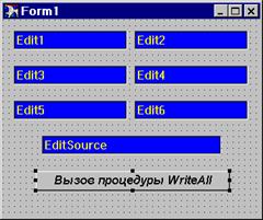 Важно понять, что объект EditSource является экземпляром класса TEdit и, следовательно, имеет свойство Text, содержащее набранный в строке редактирования текст. Как Вы уже, наверное, успели заметить, по умолчанию свойство Text содержит значение, совпадающее со значением имени компонента (Name) - в данном случае “EditSource”. Свойство Text Вы, естественно, можете редактировать как в режиме проектирования, так и во время выполнения. Текст, который должен быть отображен в шести строках редактирования, передается процедуре WriteAll как параметр. Чтобы передать параметр процедуре, просто напишите имя этой процедуры и заключите передаваемый параметр (параметры) в скобки - вот так:
