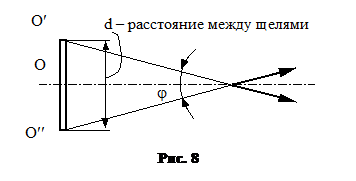 Для получения окончательной разности хода необходимо учесть, что световые волны, как и всякие другие волны, отражаясь от оптически более плотной среды (луч 1 в точке С) получают дополнительную разность фаз равную p, т.е. возникает добавочная разность хода равная l/2. При отражении от среды оптически менее плотной (точка О) скачка фазы не происходит. Таким образом, при падении на пластинку плоской волны образуются две отраженные волны, разность хода которых определяется формулой: