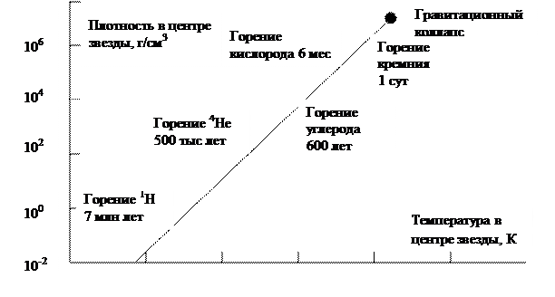 Рис. 9.8. Эволюция массивной звезды (М > 25MQ) В последнем случае в качестве эталонной сверхновой берутся лишь сверхновые Ia типа. Определение: Под сверхновой Ia типа понимается такая сверхновая звезда, в спектре которой отсутствует линия водорода. Механизм вспышек сверхновых звёзд типа (SN Ia) следующий. Это так называемая термоядерная сверхновая, в основе механизма взрыва которой лежит процесс термоядерного синтеза в плотном углеродно-кислородном ядре звезды. Предшественниками SN Ia являются белые карлики с массой, близкой к пределу Чандрасекхара. Принято считать, что такие звезды могут образовываться при перетекании вещества от второй компоненты двойной звёздной системы. При увеличении массы белого карлика постепенно увеличивается его плотность и температура. Наконец, при достижении температуры порядка 3×108 K, возникают условия для термоядерного поджигания углеродно-кислородной смеси. От центра к внешним слоям начинает распространяться фронт горения, оставляя за собой продукты горения — ядра группы железа. Начинаются интенсивные крупномасштабные конвективные процессы, приводящие к ещё большему усилению термоядерных реакций и выделению необходимой для сброса оболочки сверхновой энергии (~1051 эрг).
