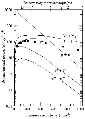 На рис.9.10 слева показаны энергетические спектры главных компонент первичных космических лучей. На рис 9.10 справа показаны вертикальные потоки главных компонент космических лучей с энергией > 1 ГэВ в атмосфере Земли. Кроме протонов и электронов все частицы возникли в результате взаимодействия первичных космических лучей с ядрами атмосферы. В результате взаимодействия с ядрами атмосферы первичные космические лучи (в основном протоны) создают большое число вторичных частиц - пионов, протонов, нейтронов, мюонов, электронов, позитронов и фотонов. Таким образом, вместо одной первичной частицы возникает большое число вторичных частиц, которые делятся на адронную, мюонную и электронно-фотонную компоненты. Такой каскад покрывает большую территорию и называется широким атмосферным ливнем.
