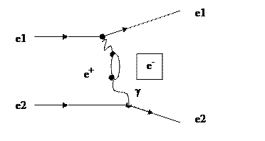 Диаграммы Фейнмана показывают, как произошло взаимодействие между частицами. На диаграммах частицы изображаются линиями, а точки (вершины), из которых выходят эти линии (или в которые приходят), показывают места локальных взаимодействий частиц. Рассмотрим простейшую диаграмму рассеяния двух электронов за счёт электромагнитного взаимодействия. Процесс развивается в пространстве и во времени. Ось времени t направлена слева направо. Координатная ось х, условно отражающая положение частиц в пространстве, направлена снизу вверх (эти оси на диаграммах обычно не показывают). Диаграмма “читается” следующим образом. До взаимодействия (t < t1) имелись два свободных сближающихся электрона е1 и е2. Им отвечают незамкнутые слева линии. Взаимодействие между ними произошло в период времени t1 – t2. В точке (вершине) 1, отвечающей моменту t1, электрон е1 испустил фотон (переносчик электромагнитного взаимодействия) и, испытав отдачу, изменил направление движения. Фотон, изображённый волнистой линией, распространяется в сторону электрона е2 и в точке (вершине) 2 в момент времени t2 поглощается им. Электрон е2, испытав отдачу, также изменяет направление движения. Далее электроны разлетаются, не испытав больше никаких взаимодействий. Каждому элементу диаграммы отвечает известная функция или множитель, которые по известным правилам объединяются в математическое выражение, дающее вероятность процесса. Линиям со свободными электронами, приходящим из t = -∞ и уходящим в t = +∞, отвечают реальные частицы. Внутренним линиям отвечают виртуальные частицы, распространяющиеся от точки рождения до точки поглощения (в данном случае это виртуальный фотон). Приведённая диаграмма показывает самый простой вариант электрон-электронного рассеяния. Для получения полной вероятности этого процесса необходимо учесть все возможные диаграммы, которые могут иметь очень разветвлённую структуру.