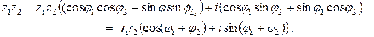 Таким образом, при перемножении комплексных чисел в тригонометрической форме их модули перемножаются, а аргументы складываются. В частности,