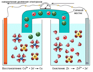 Электродные потенциалы и электродвижущие силы. Стандартный водородный электрод window.top.document.title = "7.2. Электродные потенциалы и электродвижущие силы. Стандартный водородный электрод"; Если же процессы окисления и восстановления пространственно разделить, то любую окислительно-восстановительную реакцию можно использовать для получения электрической энергии. Такие устройства называют химическими источниками тока (ХИТ). Простейший ХИТ – гальваническая ячейка – представляет собой сосуды, в которых два электрода, помещенные в раствор соответствующих электролитов, соединены солевым мостиком (проводником второго рода *), представляющим собой стеклянную трубку, заполненную раствором такого электролита, катионы и анионы которого характеризуются одинаковой подвижностью. При замыкании внешней цепи проводником первого рода начинается окислительно-восстановительная реакция, о чем свидетельствует возникновение электродвижущей силы (ЭДС). *) В проводниках второго рода носителями заряда служат ионы, в отличие от электронов в проводниках первого рода. Реакция CuSO4 + Zn = Cu + ZnSO4 в электрохимическом варианте является основой гальванического элемента Даниэля–Якоби, схема которого