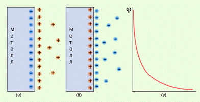 Если концентрация ионов металла в растворе меньше равновесной, то при погружении металла в раствор равновесие смещается вправо, что приводит к отрицательному заряду на металле по отношению к раствору. Если малоактивный металл погружен в раствор соли с концентрацией больше равновесной, то происходит переход ионов из раствора на металл, заряженный положительно. В любом случае возникает двойной электрический слой, и появляется разность электрических потенциалов, или гальвани-потенциал. Система, состоящая из металла, погруженного в раствор электролита, называется электродом, то есть электроды в электрохимии – это системы из двух токопроводящих тел: проводников 1 и 2 рода. Абсолютное значение разности потенциалов на границе двух фаз разной природы металл│электролит измерить нельзя, однако можно измерить разность потенциалов двух различных электродов.