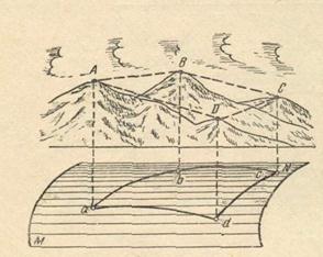 Расстояния Аа, Bb, Cc, Dd от точек местности до уровенной поверхности называют высотами точек. Сферические поверхности неудобны для работы и поэтому прибегают к плоским изображениям земной поверхности. Чтобы привести сферическую поверхность вместе с изображенными объектами в плоское изображение, прибегают к специальным картографическим проекциям. Чаще всего используется равноугольная картографическая проекция. Если изображаемый участок поверхности невелик, то уровенную поверхность можно принять за горизонтальную плоскость.