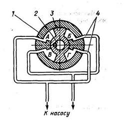 Рис. 10.10. Устройство 2-лопастного гидродвигателя рулевой машины: 1 – корпус гидродвигателя; 2 – баллер руля; 3 – лопасти; 4 - трубопроводы