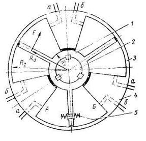 Трехлопастной ротор 1, являющийся румпелем, насажен на верхнюю часть головы баллера 2. Этот ротор помещен в цилиндр 3, разделенный тремя перемычка ми 4. Последние делят общий объем цилиндpa на три рабочие полости, каждая из которых делится лопастью ротора на две части А и Б. Цилиндр крепится к палубе посредством амортизирующего устройства. При нагнетании масла в полость А и сливе его из полости Б ротор и баллер будут поворачиваться против часовой стрелки. При подаче масла в полость Б – наоборот. Подвод и слив масла производятся через перемычки цилиндра от общих магистралей «а» и «б», связанных с насосом. В днище и крышке силового цилиндра пре- думотрены сальниковые уплотнения из маслостойкой резины. Уплотнения имеются также между зеркалом цилиндра и торцом каждой лопасти и между перемычками и ступицей ротора. Для ограничения утла поворота ротора в одной из лопастей имеется пружинный двухсторонний клапан 5, который сообщает полости А и Б между собой при достижении предельных значений перекладки руля. Наличие сложных уплотнений снижает объемный к.п.д. машины, ограничивает допустимые рабочие давления масла до 4,00 - 6,50 МПа (40-65 at), что является недостатком привода, не позволяющим его использовать при моментах на баллере, превышающих 400-500 кН*м.