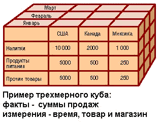 На рисунке представлен трехмерный куб, где в качестве фактов использованы суммы продаж, а в качестве измерений - время, товар и магазин, определенных на разных уровнях группировки: товары группируются по категориям, магазины - по странам, а данные о времени совершения операций - по месяцам.
