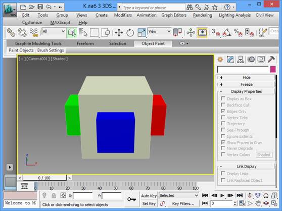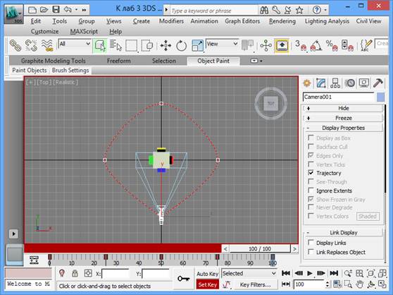 22. Нажмите кнопку Set Keys. Создастся ключ в текущем кадре. 23. Выключите режим записи ключей анимации. 24. Ползунок (под окном) переместите в позицию 0/100 (можно воспользоваться кнопкой Go To Start). 25. Сверните окно Top. Выберите окно Camera01. 26. Нажмите кнопку Play Animation. Убедитесь, что в окне изменяется вид сцены, так как бы это было, если бы камера вращалась вокруг сцены. 27. Остановите анимацию, нажав на ту же кнопку Stop Animation.