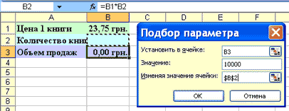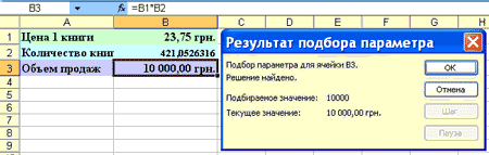 После завершения итерационного цикла в окне диалога Результат подбора параметра появляется сообщение, а результат заносится в ячейку листа. Решение показывает, что для достижения объема продаж 10000 грн. необходимо продать 421 книгу по цене 23,75 грн. Для закрытия окна диалога Результат подбора параметра щелкните на кнопке ОК.