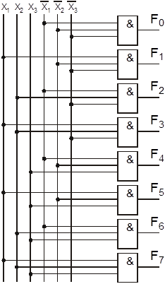 Данная система функций характеризует так называемый полный дешифратор. На практике возможны неполные дешифраторы, реализующие только часть вышеуказанных функций. В зависимости от разрядности входного кода и архитектуры логических элементов дешифратор может быть реализован на основе одноступенчатой (или линейной) и многоступенчатой схемы. В интегральном исполнении распространение получили линейные дешифраторы. В них каждая функция Fi реализуется на отдельном конъюнкторе, имеющем N входов и один выход. Линейный дешифратор на 3 входа и 23=8 выходов представлен на рис. 43.