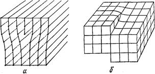 Таким образом, для любых реальных значений плотности собственных дефектов их концентрация является экспоненциальной функцией обратной температуры. Аналогичные выражения можно получить и для равновесных концентраций других точечных дефектов. В общем случае минимизация функционала свободной энергии Дислокации. Точечные дефекты, например вакансии, вызывают нарушения решетки лишь в окрестности одного узла решетки (или в крайнем случае нескольких соседних узлов). Дислокации же приводят к линейным нарушениям структуры. В общем случае дислокации в кристалле могут иметь любую форму, однако понять их строение можно на примере двух простейших типов дислокации: краевой и винтовой. В случае чисто краевой дислокации одна из атомных плоскостей внутри кристалла обрывается, напоминая лезвие ножа при нарезании сыра. Этот тип дислокаций иллюстрирует рис. 10, а. Сдвиг в решетке (определяемый вектором Бюргерса