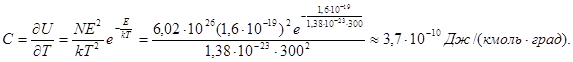 где Dс/y – падение концентрации вдоль слоя толщиной у. С другой стороны, считая концентрацию на границе слоя постоянной, можно принять приращение толщины пропорциональным количеству продиффундировавшего вещества, т.е.: dm = aSdy, где а - некоторый коэффициент пропорциональности. Тогда Пример 3. Пусть энергия, требуемая для перемещения атома натрия из внутренней части кристалла на поверхность, равна 1эВ. Вычислить теплоемкость металла при комнатной температуре, обусловленную наличием в нем дефектов Шоттки. РЕШЕНИЕ. Число дефектов Шоттки в твердом теле