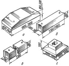 Рис. Изделия для фундаментов: а — блок-подушка; б — блок для стен подвалов сплошной; в — то же, пустотелый; г — блок стаканного типа.