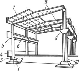 Рис. 13.4. Схема одноэтажного промышленного здания с железобетонным каркасом: 1 — фундамент под колонны; 2 — колонны наружного ряда; 3 — подкладка; 4 — фундаментная балка; 5—стеновая панель; 6— подкрановая балка; 7—плита покрытий; 8— балки (формы) покрытия; 9— консоли колонн; 10— колонны внутреннего ряда