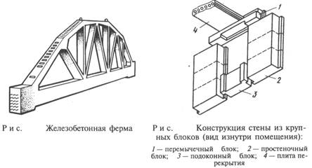 Ригели, балки и фермы часто изготовляют из напряженно-армированного бетона. Все изделия для надежной связи друг с другом и передачи нагрузки имеют металлические закладные детали. Изделия для каркасов промышленных зданий (рис. 13.4) отличаются от аналогичных изделий для жилых здании большей несущей способностью и размерами. Так, высота колонн для жилых зданий достигает 7,5 м, а промышленных 35 м. Стеновые бетонные блоки предназначены для жилых и общественных зданий, а также производственных зданий промышленного и сельскохозяйственного назначения. Один из вариантов конструкции наружной стены из блоков показан на рис.ниже.