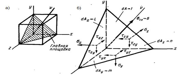 Рис. 5.2 Наклонная площадка (а) и равновесие тетраэдра, выделенного главной площадкой (б) Примем площадь наклонной грани тетраэдра dA=1, тогда площади других граней будут равны: