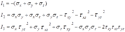 Следовательно, рассматриваемое состояние является трехосным (рис. 5.4 б). Если площадки элементарного параллелепипеда, выделенного в окрестности точки, являются главными, то для инвариантов напряженного состояния имеем следующие формулы: