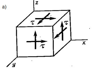 Таким образом, на рис 5.3 а представлено одноосное напряженное состояние с напряжением Пример 5.2 Предположим, что рассматривая напряженное состояние в точке, мы выделили в ее окрестности элементарный параллелепипед и на его гранях обнаружили систему только равных касательных напряжений τ.