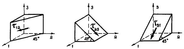 Рис 5.5. Площадки экстремальных касательных напряжений (оси 1,2,3 параллельны главным напряжениям
