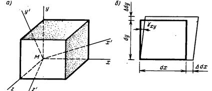 Рис. 5.6 Совокупность деформаций для всевозможных осей, проведенных через точку М, представляет деформированное состояние в точке (а); деформации элемента в плоскости x-y (б) Деформации элемента в трех ортогональных плоскостях представим в виде тензора деформаций (см. 1.4):