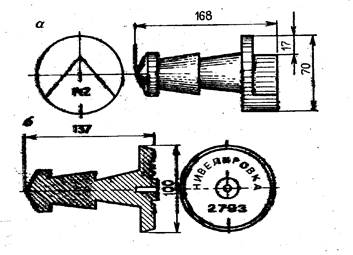 Грунтовый репер из металла (рельс) бетонируется в яме, а деревянный закапывается в яму. В верхней части выделяется точка для передачи отметки. Стенные реперы и марки (рисунок 42) закладывают в стены массивных сооружений, в устои мостов и гидротехнических сооружений: плотины, шлюзы, насосные станции и т.д. Временные знаки (рисунок 43) устанавливают на период топографических съемок.