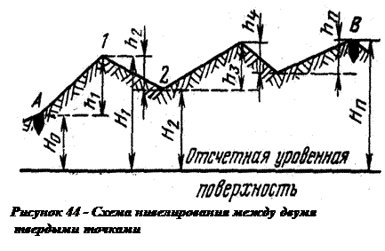 Нивелированием называют определение превышений между отдельными точками земной поверхности с последующим вычислением их высот над принятой отсчетной уровенной поверхностью. Если высоты точек вычислены относительно основной уровенной поверхности (уровня Балтийского моря), их называют абсолютными высотами. Если они вычислены относительно другой, условно взятой поверхности, их называют условными. Нивелирование производят для изучения рельефа местности с целью построения профилей и топографических планов (карт), а так же определения разности высот отдельных точек при проектировании, строительстве и эксплуатации инженерных сооружений: каналов, плотин, водохранилищ и др. Различают следующие методы нивелирования: геометрический, тригонометрический, физический, механический, стереофотограмметрический. Геометрическое нивелирование выполняют горизонтальным лучом визирования. При этом используют нивелир и рейки. Тригонометрическое нивелирование выполняют наклонным лучом визирования. Измерив угол n и расстояние d между точками, превышение вычисляют по тригонометрическим формулам. Физических методов нивелирования несколько. При этом используют определенные закономерности природных явлений. Сюда относят барометрическое, гидростатическое, радио и звуковое нивелирование. Барометрическое нивелирование основанона определении атмосферного давления при помощи барометра, которое изменяется в различных по высоте слоях атмосферы. Гидростатическое нивелирование основано на законе равенства уровня жидкости в сообщающихся сосудах. Механическое нивелирование выполняют нивелирами-автоматами. Установленные на движущемся транспорте (автомашине, велосипеде), они позволяют автоматически вычерчивать профиль пройденного пути. Стереофотограмметрическое нивелирование применяют при наземной съёмке и аэросъёмке. Здесь высоты точек определяются по измерениям на стерео снимках. Сущность нивелирования заключается в следующем. Если известна абсолютная высота точки А (НА),то для получения высоты точки В (НВ) надо проложить нивелирный ход, т.е. измерить превышения h1 h2 …hn (рисунок 44). Н1 = НА + h1; Н2 = Н1 + h2 ;... Нn = Hn-1 + hn.