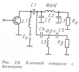 Переход транзистора из одного состояния в другое происходит за.некоторое конечное время. В течение этого времени транзистор находится в активном состоянии и потери в нем оказываются значительно больше, чем в состоянии насыщения. Кроме того, в ключевом генераторе возникают ключевые потери вследствие наличия паразитных реактивностей. Эти потери возрастают с ростом частоты, что ведет к понижению КПД. Ключевой генератор с резистивной нагрузкой применяется в транзисторных передатчиках на длинных, средних и коротких волнах. В ключевом генераторе высшие гармоники молено выпрямить и эту мощность возвратить в цепи питания. Это дает дополнительную возможность повысить эффективность ключевого режима.