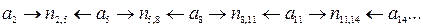 За рівнянням Розглянувши два приклади із різною кількістю спотворених інформаційних символів, можна зробити наступні висновки про те, що: 1. В разі, коли спотворення перевищує можливості коду, код не лише не здатен виявляти та виправляти спотворення, але і вносить додаткові спотворення: 2. Інформаційні символі одного ланцюга розташовуються на відстані λ інформаційних та λ перевірочних, отже на відстані 2 λ символів один від іншого; 3. Місце розташування перевірочних символів визначається двома обставинами: по-перше, групова завада не повинна одночасно охвачувати інформаційні і відповідні перевірочні символи; по-друге, не повинно бути неправильного виправлення інформаційних символів. Із цих міркувань перевірочні символи розташовуються на відстані 2 λ + 1 символів від найближчого свого інформаційного. Наприклад, перевірочний символ При цих умовах згортальний код виправляє групове спотворення із λ інформаційних символів (див. перший приклад). Розглянемо приклад формування інформаційної послідовності для кроку додавання λ = 2 номерів символів. Із викладеного раніше зрозуміло, що: 1. Інформаційні та перевірочні символи повинні чергуватися. Для визначеності будемо вважати, що інформаційні символи мають непарні номери, а перевірочні – парні; 2. Повинні бути сформованими два (λ = 2) незалежних ланцюги формування перевірочних (а в подальшому і контрольних) символів. В таблиці 1 наведено розподіл номерів символів послідовності між інформаційними та перевірочними (контрольними) та розподіл номерів інформаційних символів між ланцюгами. Таблиця 1