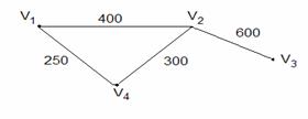 Рисунок 3.4.2 V1 - Астана, V2 - Экибастуз, V3 - Семипалатинск, V4 - Караганда. V={V1, V2, V3, V4}, Е={{V1, V2 },{V2, V3}, { V1, V4},{ V2, V4}}, f: V Информацию о весах дуг во взвешенном графе можно представлять в виде матрицы весов W=(wij), где wij – вес дуги (vi,vj), если эта дуга существует, если не существует, то соответствующий вес обозначают 0 или ∞, в зависимости от приложений (∞ - если вершины не смежные). Для графа из примера 3.4.2 матрица весов имеет вид: W= Для взвешенных графов аналогично вводятся понятия расстояния, эксцентриситета и т.д. Нахождение кратчайших маршрутов (путей) Существуют различные способы (алгоритмы) определения кратчайших маршрутов. Выбор каждого из них зависит от условий задачи (например, весы рёбер отрицательные или нет), от способа решения (вручную или на компьютере) и т.д. Рассмотрим алгоритм Дейкстры, который можно использовать только для взвешенных графов с неотрицательными весами всех рёбер. Рассмотрим два варианта алгоритма Дейкстры (с использованием и нет матрицы весов). Алгоритм Дейкстры 1. Пусть G(V,E) – взвешенный граф, имеющий n вершин и W=(wij), его матрица весов Обозначим Т1 множество вершин V - { vi}, т.е. Т1 – это множество всех вершин V без источника. Обозначим D(1)=(d1(1), d2(1), …, dn(1)), где di(1)=0, dj(1)= wij (i≠j), т.е. D(1) – это і-ая строка в матрице весов. Пусть на шаге S уже определены множества вершин TS и строка D(S)=(d1(S), d2(S), …, dn(S)). Наша задача перейти от TS к TS+1 и от D(S) к D(S+1). Выберем в TS вершину vj такую, что dj(S)=min{ dk(S)/ vk
