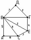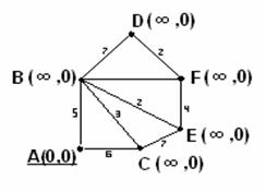 Рисунок 3.4.4 Рисунок 3.4.5 Найти кратчайшее взвешенное расстояние и путь от вершины А до вершины F. 1 шаг. Всем вершинам припишем метки 2 шаг. Рассмотрим смежные с А вершины В и С, т.к. вес 3 шаг. Выбираем минимальный из весов, приписанных В и С, – это 5. Поэтому вершину В(5,А) делаем постоянной, подчёркиваем (рисунок 3.4.6).