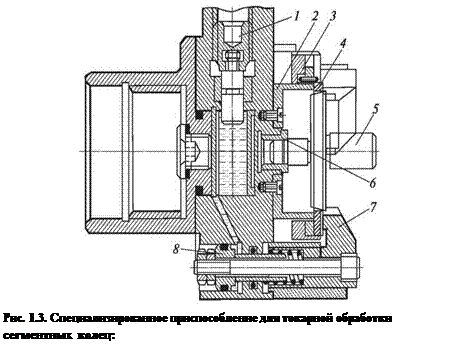 Типы и основные размеры СНП определены государственными стандартами. Область применения СНП охватывает все типы серийного производства в условиях групповой обработки заготовок. Специализированное наладочное приспособление для токарной обработки сегментных колец представлено на рис. 1.3. Заготовку 4 собирают с кассетой 3 и вместе с ней устанавливают до упора на опорную поверхность базового элемента 2. Центрирование производится с помощью калибра 5 по втулке 6. Закрепление осуществляется винтом 1 с передачей зажимного усилия через гидравлическую среду на поршень 8 и кулачки 7. Для обработки сегментного кольца другого размера необходимо сменить наладку.