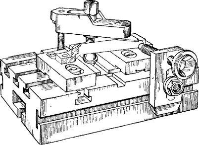 Рис. 1.2. Универсальное приспособление для обработки заготовок различных диаметров под разными углами Универсальные безналадочные приспособления (УБП) — используют для закрепления заготовок широкой номенклатуры и различной конфигурации. Отличительная черта УБП − неотъемлемая принадлежность станков. Этими приспособлениями станки комплектуются. Без этих приспособлений станки работать не могут. Конструкции УБП стандартизованы (более 40 государственных стандартов). Изготавливаются специализированными предприятиями. УБП предназначены для единичного и мелкосерийного производства, а при малых коэффициентах загрузки (менее 0,5) одной операцией рентабельны во всех типах производства. Представители системы УБП: центры и полуцентры, оправки, универсальные тиски, токарные патроны, универсальные патроны, магнитные патроны, универсальные поворотные и делительные столы, головки, цанговые приспособления, плиты, поводковые устройства, стойки кондукторные. Настройка УБП осуществляется за счет регулирования зажимных элементов оснастки. УБП − обеспечивает базирование только при наличии контроля и выверки при невысоких требованиях по точности и взаимозаменяемости. УБП − находятся в эксплуатации до полного физического износа. Преимущества УБП: минимальные затраты времени для подготовки к работе и высокая универсальность. Недостаток – обратная сторона универсальности − значительные потери вспомогательного времени. Универсально-наладочные приспособления (УНП) применяют для установки и закрепления определенной группы схожих по форме заготовок деталей, обрабатываемых на токарных, фрезерных, сверлильных и др. станках. Универсально-наладочные приспособления состоят из двух частей: универсальной (постоянной) и наладочной (сменной). Универсальная часть включает в себя корпус, силовой привод и базовые элементы для установки сменных наладок. Наладочная часть состоит из сменных наладок, изготавливаемых в соответствии с формой и габаритными размерами обрабатываемых деталей. Трудоемкость изготовления сменных наладок УНП на 60−70 % меньше трудоемкости изготовления специальных приспособлений для установки таких же деталей. Универсальную часть УНП используют многократно, что значительно сокращает сроки и стоимость подготовки производства при выпуске новых машин. При смене объекта производства утилизируются только сменные наладки, базовая же часть, не изношенная физически, используется в комплекте с другими наладками для обработки заготовок других деталей. За счет этого достигается значительная экономия металла и других средств. К числу нормализованных приспособлений, на базе которых собирают УНП, относятся машинные тиски, скальчатые кондукторы, пневматические патроны со сменным кулачками, планшайбы с переставными угольниками для растачивания на токарном станке деталей сложной формы и т. д. УНП применяют в серийном производстве; на станках с ЧПУ – в мелкосерийном производстве. Применение УНП позволяет значительно увеличить оснащенность операций технологического процесса. Специализированные безналадочные приспособления (СБП) — используют для закрепления заготовок, близких по конструктивно-технологическим признакам, с одинаковыми базовыми поверхностями, требующих одинаковой обработки. При осуществлении однотип