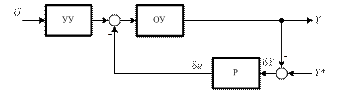 Здесь исходная информация о цели в виде задающего воздействия y *(t) сравнивается с текущим значением y (t) управляемой переменной. Результат сравнения в виде отклонения d y поступает на регулятор Р, вырабатывающий дополнительное управляющее воздействие d u, направленное на уменьшение этого отклонения. Полученное воздействие складывается с исходным (запланированным априорно) управляющим воздействием u *, в результате чего формируется текущее воздействие u. Подобные системы называются следящими.