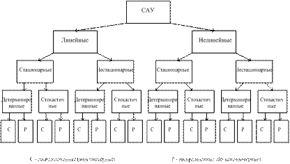 4. Вид используемой энергии. В зависимости от вида используемой для управления энергии различают электрические, механические, гидравлические, пневматические, а также комбинированные системы автоматического управления. Классы моделей. Общая классификация моделей систем управления приведена на рис. 1.16. Четыре независимых признака дают возможность формирования 24 = 16 типов непрерывных и дискретных моделей. Простейший класс – ЛСДК – линейные стационарные детерминированные конечномерные системы. Они описываются обыкновенными дифференциальными уравнениями с детерминированными коэффициентами. Для анализа и синтеза таких систем существует развитый математический аппарат. Далее мы будем рассматривать системы именно этого класса. Более сложные классы формируются введением одного или нескольких альтернативных признаков. Для систем второго и более