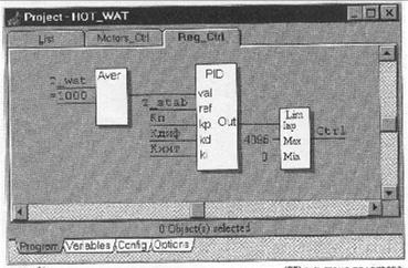 Рис. 35. Пример автоматизированной системы подогрева воды, запрограммированной средствами ULTRALOGIK Холодная вода нагревается в теплообменнике ТО. Давление холодной воды обеспечивает двигатель M1, двигатель М2 является резервным. Количество горячей воды от ТЭЦ в теплообменнике регулируется аналоговым регулятором РТ с приводом постоянного тока. Температура нагреваемой воды зависит от положения регулятора РТ. Проект содержит две программы Моtors_Ctrl - управление насосами (рис.36) и Reg_Ctrl - управление регулятором температуры (рис.37).Проект имеет следующие переменные и константы. Входные переменные: - Alarm_M1 - сигнал неисправности двигателя Ml; - Alarm_M2 - сигнал неисправности двигателя М2; - T_wat - температура воды в контуре горячего водоснабжения. Выходные переменные: - Start_М1 - пуск двигателя Ml; - Start_M2 - пуск двигателя М2; - Ctrl - управление приводом РТ. Глобальные переменные: - T_stab - температура стабилизации (задатчик); - Start - пуск одного из двигателей. Константы, определяющие параметры ПИД-регулятора: - Кп - коэффициент пропорционального управления; - Кдиф - коэффициент дифференциального управления; - Кинт - коэффициент интегрального управления. Переменные Start и T_stab являются сетевыми, и их значение устанавливает система визуализации верхнего уровня. При получении сигнала Start и отсутствии сигнала Alarm_Ml включается двигатель Ml. В том случае, если двигатель Ml неисправен (А1агт_М1=Тruе), включается двигатель М2. Функциональный блок Aver вычисляет среднее значение измеренной температуры воды. Число замеров задается параметрически (в приведенном примере 1000). Вычисленное значение температуры подается на вход ПИД-регулятора. На другой вход регулятора подается значение уставки (в данном примере T_stab). Величина рассогласования между заданным и истинным значением параметра является аргументом функции регулирования. Коэффициенты регулирования задаются параметрически. Выходной сигнал регулятора ограничивается разрешенными пределами цифро-аналогового преобразователя и непосредственно управляет приводом постоянного тока. Все приведенные функции данного проекта реализуются с помощью модуля 5710 Analog Input Card фирмы Octagon Systems.
