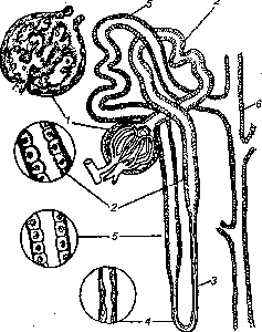 Рис. 7 - Схема строения нефрона (по Смиту): (увеличить рисунок): 1 - клубочек; 2 - проксимальный извитой каналец; 3 - нисходящая часть петли нефрона; 4 - восходящая часть петли нефрона; 5 - дистальный извитой каналец; б - собирательная трубка. В кружочках дана схема строения эпителия в различных частях нефрона