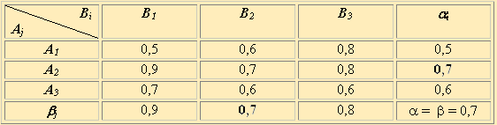 Решение. Все расчеты удобно проводить в таблице, к которой, кроме матрицы Р, введены столбец αi, и строка β j (таблица 3.3). Анализируя строки матрицы (стратегии игрока А), заполняем столбец αi: α1 = 0,5, α2 = 0,7, α3= 0,6 — минимальные числа в строках 1, 2, 3. Аналогично βi: β1 = 0,9, β2 = 0,7, β3= 0,8 — максимальные числа в столбцах 1, 2, 3 соответственно.