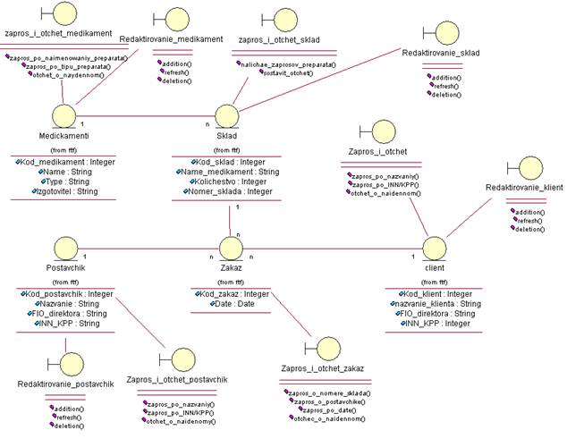 На основании анализа структуры учреждения, документооборота, системы отчетности были разработаны следующие классы: Класс заказ Данный класс является центральным по отношению ко всем остальным, обеспечивая связь остальных классов в системе. Содержит сведения о заказе даты, клиенте, поставщике и складе. Класс Склад Содержит сведения о складе: код склада, медикамент, количество медикамента Класс Медикаменты Содержит сведения о Издательство: наименование, тип, производитель. Класс Клиент Содержит сведения о Клиенте: Название, ИНН/КПП, ФИО директора. Класс Поставщик Содержит сведения о Поставщике: Название, ИНН/КПП, ФИО директора.
