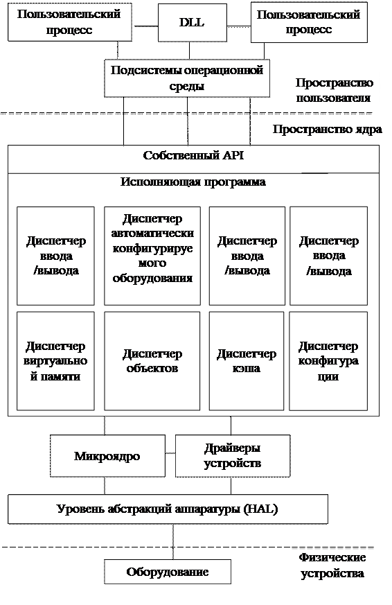 общей иерархии, где нижние уровни обеспечивают функциональность верхних уровней. Но, в отличие от строго иерархических систем, возможны ситуации, когда между собой могут общаться несмежные уровни. Ниже показана архитектура системы Windows ХР. Уровень абстракций аппаратуры (Hardware Abstraction Layer,HAL) взаимодействует непосредственно с оборудованием, скрывая детали взаимодействия ОС с конкретной аппаратной платформой для остальной части системы. HAL позволяет абстрагироваться от конкретного оборудования, которое в разных системах с одной и той же архитектурой может быть различным. В большинстве случаев, компоненты, выполняемые в режиме ядра, не работают непосредственно с аппаратным обеспечением, вместо этого они вызывают функции, доступные в HAL. Поэтому компоненты режима ядра могут создаваться без учета деталей реализации, специфичных для конкретной архитектуры, таких как размер кэша и количество подключенных процессоров. HAL взаимодействует с драйверами устройств, чтобы обеспечить доступ к периферийному оборудованию. Кроме того, уровень абстракций аппаратуры взаимодействует с микроядром. Микроядро обеспечивает основные механизмы функционировали системы, такие как планирование выполнения потоков для поддержи других компонентов режима ядра. Примечание: Микроядро Windows ХР не нарушает принципы построения микроядра, рассмотренные в разделе 1.1.З. Микроядро управляет синхронизацией потоков, обслуживанием прерываний и обработкой исключений. Кроме того, микроядро позволяет не учитывать архитектурно-зависимые функциональные возможности, например, количество прерываний в различных архитектурах. Таким образом, микроядро и HAL обеспечивают переносимость операционной системы Windows ХР, позволяя ей работать на самом разнообразном оборудовании. Микроядро формирует только небольшую часть пространства ядра и предоставляет базовые услуги другим компонентам, размещенным в пространстве ядра. Выше уровня ядра расположены компоненты режима ядра, отвечающие за администрирование подсистем операционной системы (например, диспетчер ввода/вывода и диспетчер виртуальной памяти). Собирательное название этих компонентов — исполняющие или управляющие программы (executive). Исполняющие программы предоставляют услуги пользовательским процессам через интерфейс прикладного программирования (API). Тем не менее, большинство пользовательских процессов обращаются не к функциям собственного API, а вызывают функции API, предоставляемые системными компонентами пользовательского режима, которые называют подсистемами операционной среды(environment subsystems). Они представляют собой процессы, выполняемые в пользовательском режиме, которые размещаются между исполняющей программой и остальной частью пространства пользователя, экспортируя API для определенной компьютерной среды. Например, подсистема среды Win32 обеспечивает обычную 32-разрядную операционную среду Windows. Процессы Win32 вызывают функции, определенные в Windows API, подсистема среды Win32 транслирует эти вызовы функций в системные вызовы собственного API. Хотя Windows ХР и позволяет процессам, выполняемым в пользовательском режиме, вызывать функции собственного API, Microsoft рекомендует разработчикам использовать интерфейс подсистемы операционной среды. По умолчанию, 32-разрядная Windows ХР включает в себя только подсистему Win